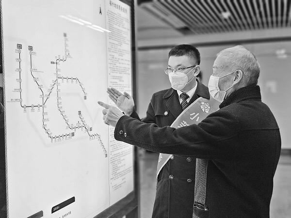 福州地铁1号线工作人员为老人指引路线。(阮曼楠 摄)