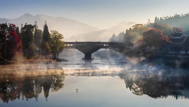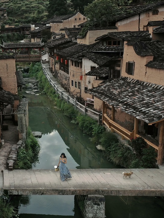 游览古村风韵,眺望水烟袅袅。棠口村始建于宋神宗熙宁元年(1068年),岭下溪和白玉溪于棠口村前交汇成棠溪。在这样一座如诗如画的水乡古镇中,一座古色古香的纯木拱桥飞跨白玉溪之上,与周边的乡村景观融为一体。千乘桥是屏南县境内第二长木拱廊桥,复刻自《清明上河图》中的木拱桥白玉虹桥。千乘桥用榫卯结构打造,是传统木构桥梁技术最高峰,2001年千乘桥被福建省人民政府定为福建省级文物保护单位,此桥也曾被著名桥梁专家茅以升主编的《中国古桥技术史》所收入。