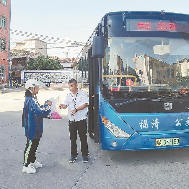 福清公交驾驶员和村级物流节点工作人员在交接邮件。