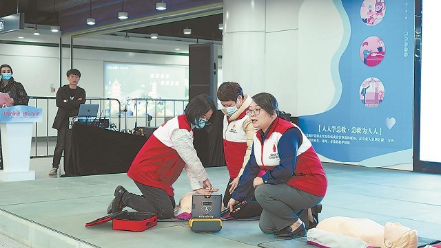 省红十字会的应急救护培训师为地铁员工及现场市民开展心肺复苏技能及家庭急救知识普及培训。