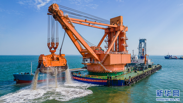 “金广”轮抓斗容量最高达200立方米,每挖一斗岩土,可将一个标准篮球场填高半米。新华网发(中交广州航道局有限公司 供图)