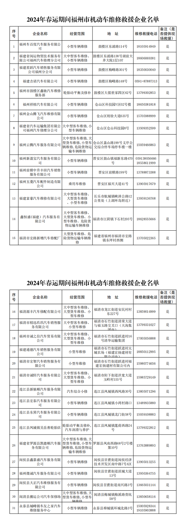 福州组织全市31家维修企业,在春运期间储备36台救援车辆、提供24小时维修救援服务。春运期间,如遇车辆紧急情况,可拨打12328交通运输服务热线,也可拨打就近救援企业电话,获得及时专业的抢修服务。