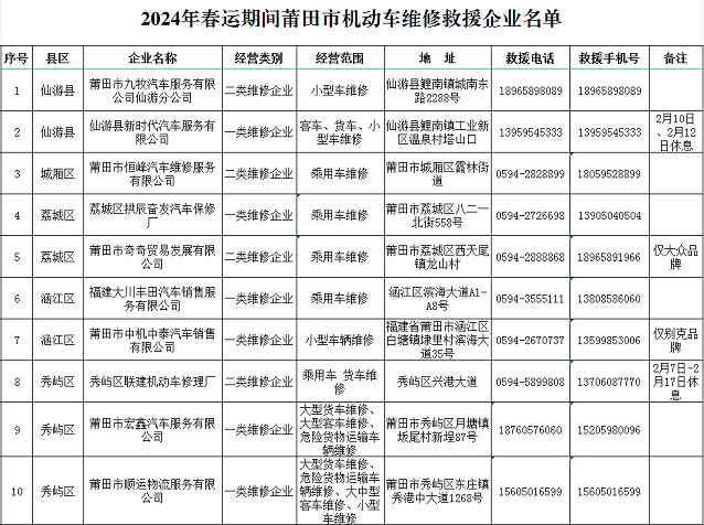 春运期间,为更好地满足广大群众应急救援服务,莆田市运输中心公布10家机动车维修救援企业作为车辆抢修网点,这些网点分布在滨海大道、兴港大道、鲤南镇、霞林街道、西天尾等地区交通主干道,可24小时提供车辆抢修、急修服务。目前,10家企业已配足应急救援维修设备及汽车常用零部件,加强维修力量储备和维修技术支持,提供维修救援服务,如遇车辆故障可拨打电话联系。