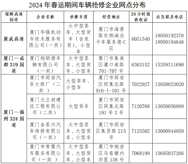 春运期间,厦门市运输中心在全市安排6家机动车维修企业作为车辆抢修网点,分布在厦成高速、319国道沿线和324国道沿线,可24小时提供车辆抢修、急修服务。目前,6家企业已做好专用维修工具及人员保障准备,如遇车辆故障可拨打电话联系。
