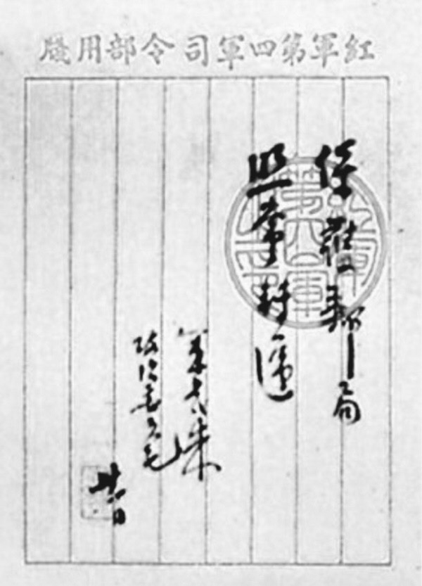 ——半年后,红军再次进驻古田,准备在这里召开红四军第九次代表大会。那时,古田已经建立苏维埃政权。在当地政府的动员下,全体人民热火朝天地投入各项革命活动中。张辑轩也接到通知,要他去参加军训以及完成别的公差,但他每天要送信,感到分身乏术。于是,他找到红四军司令部请示如何处理。朱德军长和毛泽东委员在一张“红军第四军司令部用笺”纸上用毛笔书写签发了“保护邮局,照常转递”的命令(图二),并加盖了红色圆形篆书关防印信“红军第四军之印”、下面联合署名“军长朱、政治委员毛,卅一日”字样。张辑轩拿着这张手令与当地政府沟通,当地政府就不再派他别的公差了。张辑轩每天又像一匹飞驰的骏马,高高兴兴去送信,全心全意做好邮递工作。