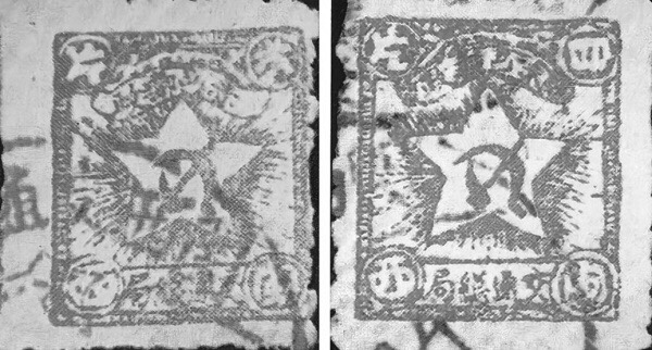 闽西交通总局赤色邮政邮票有两种版式,分别为弍片和四片(图三)。除了面值不同、颜色略有差异之外,图案都差不多,中心是五角星,星内绘镰刀和铁锤,铁锤柄向上,是为了纪念列宁而特制的。上方有“赤色邮政”4个字,下方为“交通总局”4个字。上端左右两角,有圆圈,内嵌“弍”、“片”或“四”、“片”,下端左右两角有圆圈,分嵌“闽”“西”2个字。“片”是福建西部方言,指铜元的“枚”,铜元1枚,叫1片,约为0.5分。邮票不大,只有25×27毫米,无齿孔,改良毛边纸,平板石印。