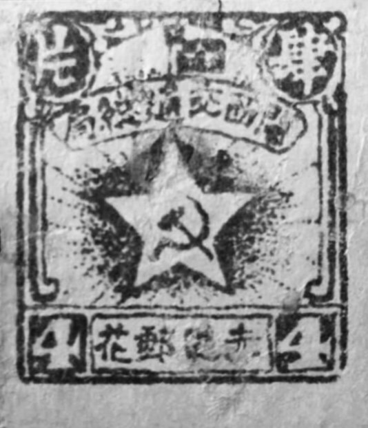 除此之外,闽西交通总局还发行过“闽西赤色邮花”邮票1枚(图四),面值肆片,主图为锤镰五星图,锤镰交叉图案与水平成大约45度角,墨绿色、无齿孔、改良毛边纸、平版石印,规格为22×25毫米。