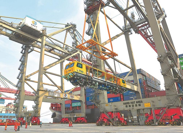 26日,中国铁路武汉局集团有限公司金鹰重工研发制造的“WD-350”型动力稳定车在厦门港远海码头顺利完成吊装作业(上图),由新加坡籍集装箱船“查拉”轮载运经停蛇口后前往埃及亚历山大港,服务当地铁路施工建设。