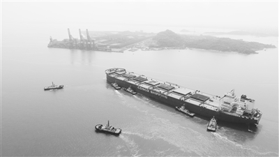 1月17日,载重40万吨的矿砂船“远谊海”号靠泊在罗屿港口卸载货物,这是今年福建港口靠泊的第一艘40万吨级货轮。