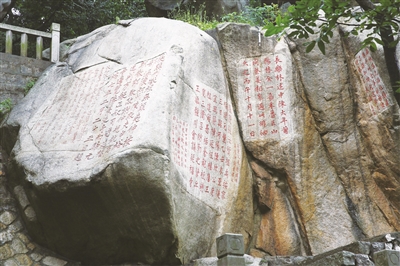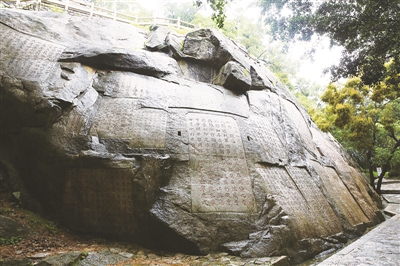 九日山以“山中无石不刻字”饮誉宇内,而全山最大的一方摩崖石刻为东峰的“九日山”三个字。宋理学大家朱熹曾两游于此,并书“九日山”三字,可惜年久风化无存。