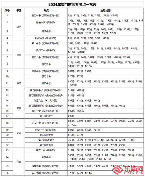 2024年厦门市高考考点一览表(厦门运输中心 供图)