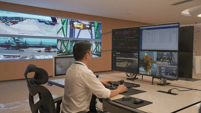 操作员正在数智中心远控室里操作着轨道吊。(王劼睿 摄)