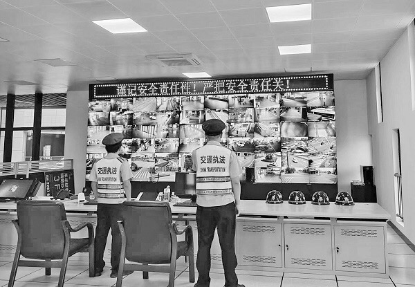 执法人员查看全市重点道路区域实时监控。(张俊逸 供图)