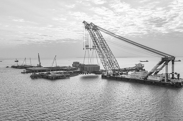 中交一公局集团厦金大桥(厦门段)项目东主塔钢套箱定位安装。(滕卓然 摄)