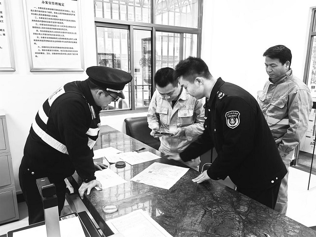 近日,危化品运输车辆剐蹭护栏后,执法人员运用路产直赔机制,为办理人员迅速办结案件。