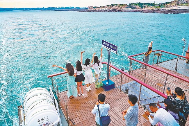 据福建平潭海上观光游轮有限公司营销经理杨小智介绍,升级后的“海坛1号”游船将推出“浪漫·海上追落日”航班、“舒心·海峡会客厅”航班两大特色主题航班,新增打卡拍照、全程解说等环节,进一步拓展海上消费新场景。图为游客在“海坛1号”上欣赏海景。