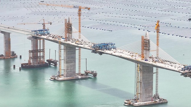 6月11日,霞浦县下浒镇海域宁上高速公路东吾洋特大桥正加紧建设。目前,全桥已完成90.94%,矮塔斜拉桥预计8月底完成合龙施工。据了解,东吾洋特大桥是宁上高速公路的重要控制性工程,全长2546.6米,桥位处水深大于50米的段落长850米,最大水深达63米,最大潮差超过8米,为同类型施工环境水深最深、桩基最长、直径最大的高速公路桥梁工程。