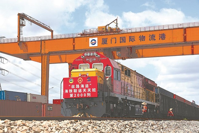 16日,第2000列“丝路海运”海铁联运天天班47622次在厦门国际物流港整装待发,准备驶向江西向塘国际陆港。(胡寻风 摄)