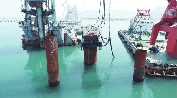 东吾洋特大桥永久钢护筒振动沉桩试验。