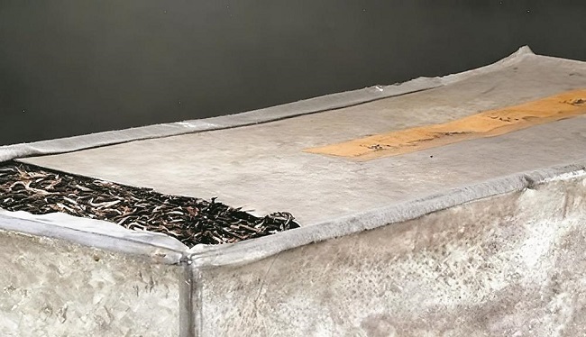 福州将军兼闽海关监督文清进贡的莲心尖茶,茶罐为锡制抽拉式长方盒,盒盖上贴明黄色“莲心尖茶”标签。