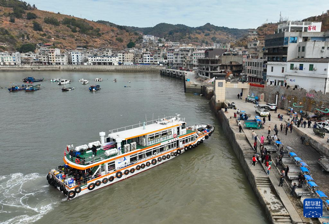 1月26日,客货邮融合班船在霞浦县海岛乡的西洋岛码头靠泊(无人机照片)。(新华社记者 林善传 摄)
