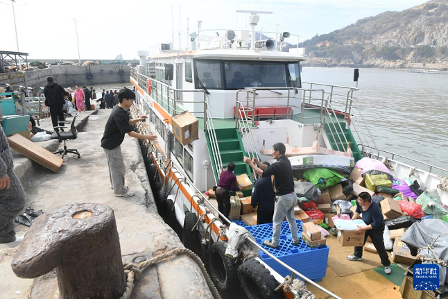 1月26日,载着快递邮件的客货邮融合班船停靠在霞浦县海岛乡的西洋岛码头。(新华社记者 林善传 摄)