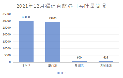 12月份,我省沿海直航港口完成对台货物吞吐量158.67万吨,同比增长1.86%,其中出口124.20万吨,进口34.47万吨,同比分别增长4.5%、-6.66%;对台集装箱吞吐量6.05万TEU,同比增长3.34%,其中出口3.03万TEU,进口3.02万TEU,同比分别增长3.77%、1.31%。其中,福州港对台货物吞吐量46.95万吨,对台集装箱吞吐量3万TEU,同比分别增长2.76%、31.58%;厦门港对台货物吞吐量54.44万吨,对台集装箱吞吐量2.92万TEU,同比分别增长18.09%、-5.81%;泉州港对台货物吞吐量8.16万吨,对台集装箱吞吐量0.06万TEU,同比分别下跌18.74%、66.67%;湄洲湾港对台货物吞吐量49.12万吨,对台集装箱吞吐量616TEU,同比分别增长-8.95%、86.67%。