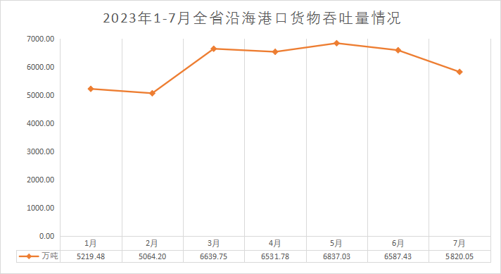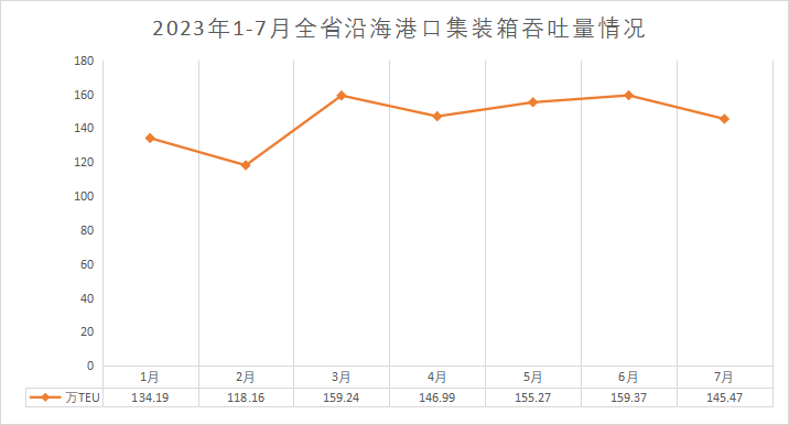7月份,受“杜苏芮”强台风影响,港口生产有所回落。当月全省沿海港口货物吞吐量完5820.05万吨,环比下降11.6%;其中集装箱吞吐量完成145.47万TEU,环比下降8.7%。1-7月份全省沿海港口货物吞吐量完成4.27亿吨,同比增长5.9%,但增速较1-6月份放缓0.7个百分点;其中,集装箱吞吐量累计完成1018.69万TEU,同比增长0.8%,但增速较1-6月份放缓0.2个百分点。