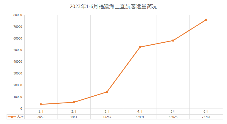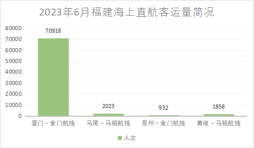 旅客运输:(自2020年2月10日起台湾方面暂停闽台海上客运,2023年1月7日起4条小三通客运航线已相继恢复通航,“大三通”客运继续暂停)“小三通”客运航线6月份共运营500航次,运载旅客75731人次,实载率为54.62%;其中台湾籍旅客73071人次,大陆籍旅客(陆配、陆生)2660人次。厦门-金门航线运载旅客70918人次,实载率为60.87%;马尾-马祖航线运载旅客2023人次,实载率为22.10%;泉州-金门航线运载旅客932人次,实载率为16.32%;黄岐-马祖航线运载旅客1858人次,实载率为25.59%。2023年1至6月闽台海上客运共运营1844航次,运载旅客209583人次,实载率为41.19%。