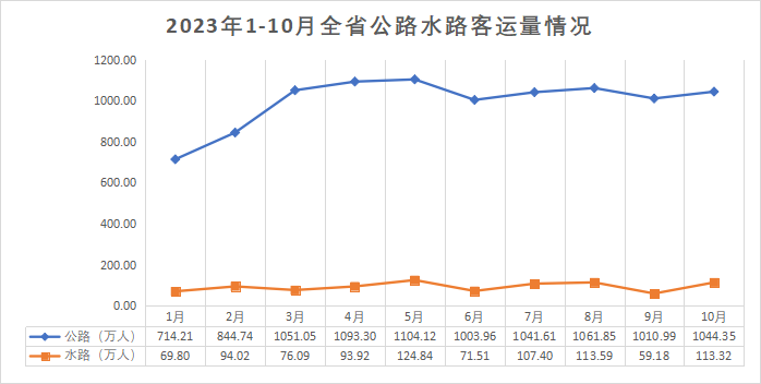 中秋国庆长假出行需求旺盛,促进全省公路水路客运持续回升,10月份全省水路旅客运输量完成113.32万人、1130.41万人公里,同比增长96.0%、104.3%;公路旅客运输量完成1044.35万人、7.76亿人公里,同比增长19.6%和16.4%。1-10月份全省累计完成水路旅客运输量923.67万人、8516.04万人公里,同比分别增长89.0%、74.2%;完成公路旅客运输量9970.17万人、71.78亿人公里,同比增长21.3%和24.3%。