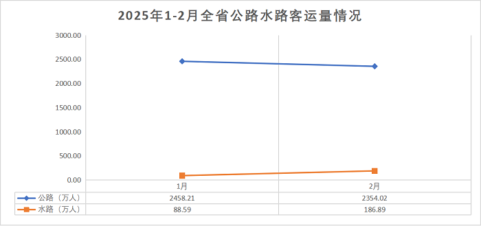 客运总体平稳。受春节错期因素影响,2月份全省旅客运输量有所波动。本月全省水路旅客运输量完成186.89万人、1325.65万人公里,同比下降1.3%、6.3%;公路旅客运输量完成2327.84万人、8.90亿人公里,同比增长2.5%、-1.4%。1-2月份全省累计完成水路旅客运输量275.48万人、2166.12万人公里,同比增长5.7%、9.1%;公路旅客运输量完成4812.23万人、18.05亿人公里,同比增长4.8%、0.7%。