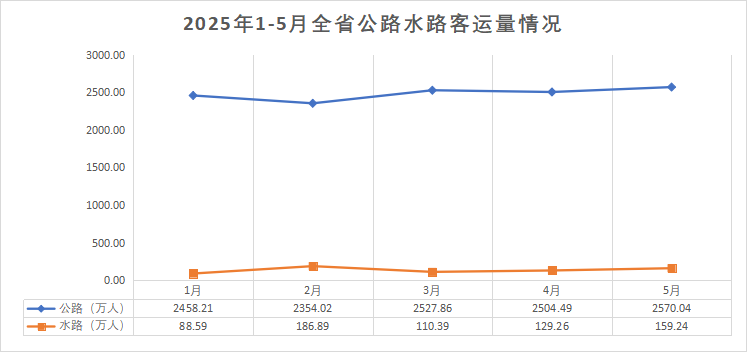 客运平稳有序。今年以来文旅活力持续激发,旅客出行意愿增强,叠加旅客联程运输加快发展,促进公路水路客流平稳有序增长。1-5月份全省累计完成水路旅客运输量674.38万人、5160.68万人公里,同比分别增长12.4%和17.6%;公路旅客运输量完成1.24亿人、48.15亿人公里,同比分别增长1.0%、-1.7%。