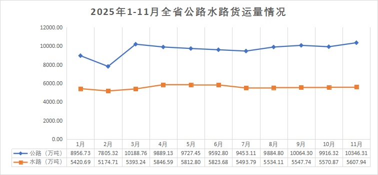 物流成本持续降低,货物运输稳定畅通。11月份全省累计完成水路货物运输量0.56亿吨、1003.30亿吨公里,同比分别增长-2.0%和0.1%;完成公路货物运输量1.03亿吨、130.12亿吨公里,同比分别增长3.4%和3.2%。1-11月份全省累计完成水路货物运输量6.12亿吨、10801.89亿吨公里,同比分别增长0.2%和3.4%;完成公路货物运输量10.58亿吨、1304.06亿吨公里,同比分别增长3.8%和1.8%。