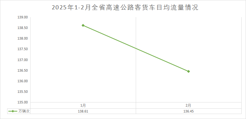 1-2月份全省高速公路客货车累计流量8117.68万辆次,日均流量137.59万辆次、同比增长0.3%,其中:货车日均流量23.03万辆次,同比增长1.2%;客车日均流量114.56万辆次,同比增长0.1%。