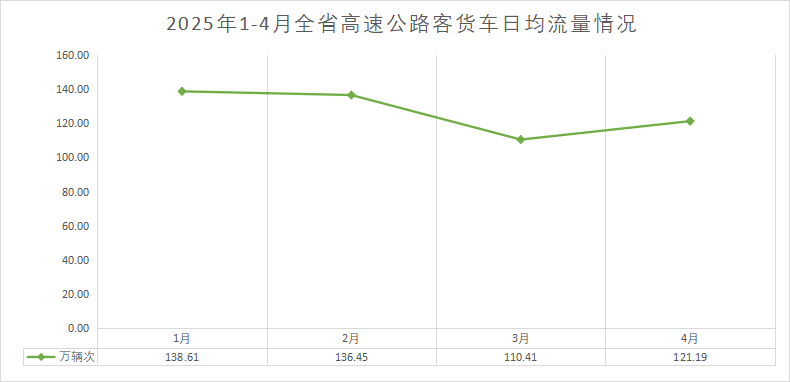 4月份全省高速公路客货车流量3635.61万辆次,日均流量121.19万辆次、同比增长3.9%。1-4月份全省高速公路客货车累计流量1.52亿辆次,日均流量126.47万辆次、同比增长1.3%,其中:货车日均流量25.55万辆次,同比增长2.7%;客车日均流量100.91万辆次,同比增长0.9%。