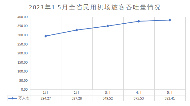 5月份全省民用机场旅客吞吐量完成382.41万人次,同比增长289.8%,环比增长1.8%;全省民用机场货邮吞吐量完成3.68万吨,同比下降0.8%,环比增长1.0%。1-5月份全省民用机场旅客吞吐量累计完成1729.02万人次,同比增长132.3%,增速较1-4月份提高23.9个百分点;全省货邮吞吐量累计完成17.36万吨,同比下降1.1%,但较1-4月份收窄0.1个百分点。1-5月末全省民用机场旅客吞吐量恢复至疫情前8.1成,货邮吞吐量恢复至疫情前8.2成。