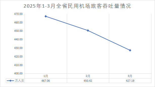 3月份全省民用机场旅客吞吐量完成427.19万人次,同比增长0.8%;全省民用机场货邮吞吐量完成4.86万吨,同比增长6.0%。1-3月份全省民用机场旅客吞吐量完成1344.56万人次,同比增长2.8%;全省民用机场货邮吞吐量完成13.55万吨,同比增长3.6%。