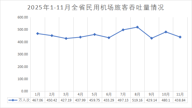 11月份全省民用机场旅客吞吐量完成438.84万人次、同比增长2.5%,全省民用机场货邮吞吐量完成4.78万吨、同比下降7.5%。1-11月份全省民用机场旅客吞吐量完成5038.33万人次、同比增长3.7%,全省民用机场货邮吞吐量完成52.40万吨、同比增长4.2%。
