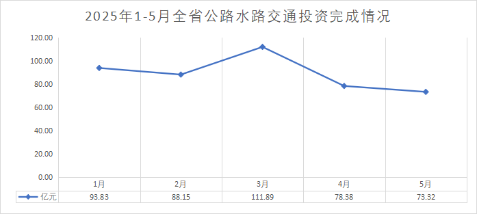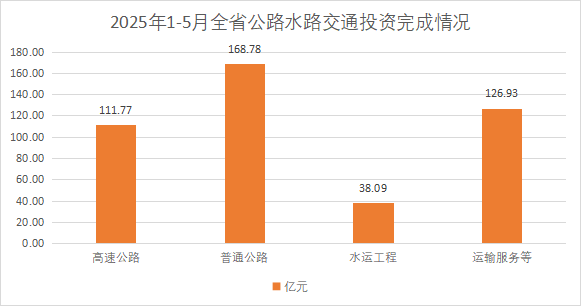今年以来,全省交通运输部门加大重点项目攻坚力度,强化资金要素保障,全力稳定交通有效投资。1-5月份全省公路水路交通投资完成445.57亿元,超序时进度2.9个百分点。其中,高速公路完成111.77亿元,超序时进度1.3个百分点;普通公路完成168.78亿元,超序时进度2.7个百分点;水运工程完成38.09亿元,超序时进度0.7个百分点;运输服务等完成126.93亿元,超序时进度5.3个百分点。