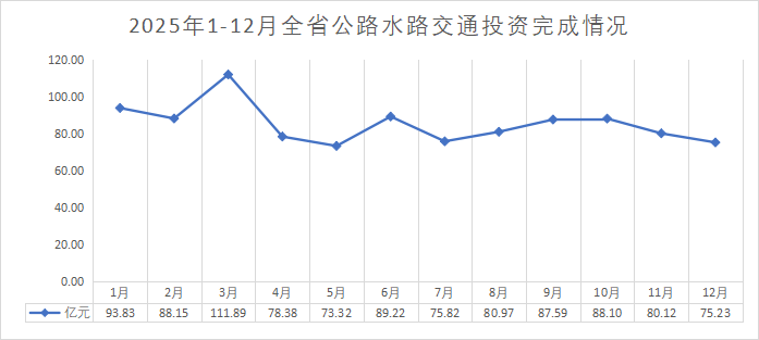 今年以来,全省交通运输部门通过优政策、强供给、促攻坚,加快推进重点项目实施取得成效。1-12月份全省公路水路交通投资累计完成1022.62亿元、同比增长0.6%,超额完成年度投资计划2.2个百分点。其中:高速公路完成268.61亿元,超额完成3.3个百分点;普通公路完成380.78亿元,超额完成0.2个百分点;水运工程完成95.15亿元,超额完成5.7个百分点;运输服务等完成278.07亿元,超额完成2.9个百分点。
