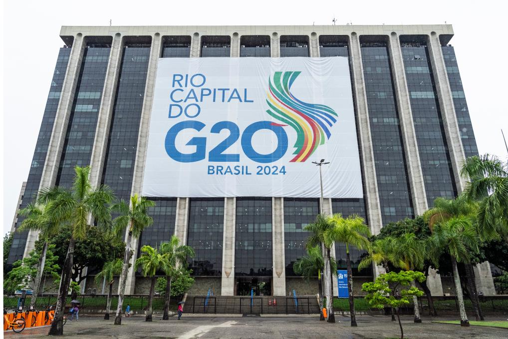 这是11月16日在巴西里约热内卢市政府行政中心外拍摄的二十国集团领导人峰会标识。新华社记者 王天聪 摄