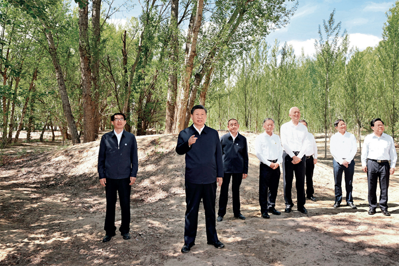 2023年6月5日至6日,中共中央总书记、国家主席、中央军委主席习近平在内蒙古巴彦淖尔考察,并主持召开加强荒漠化综合防治和推进“三北”等重点生态工程建设座谈会。这是6日上午,习近平在临河区国营新华林场考察。 新华社记者 谢环驰/摄