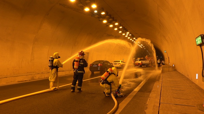 上午9时,演练正式开始。“12122吗?我驾驶一部运载液化气的危化品车在古平高速火田往云霄方向七里山隧道内被一部小货车碰撞追尾,液化气发生泄漏,小货车副驾驶室有一名乘员受伤被困。”高速公路路网中心在接到事故现场人员的报警电话后,立即通知辖区高速交警、高速执法、养护和路勤中心等部门前往处理,并在相关情报板发布提示信息和隧道交通信号灯变更。