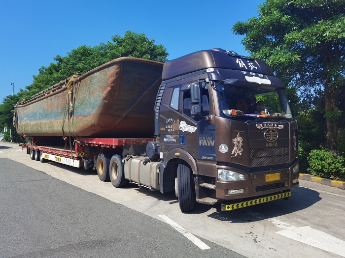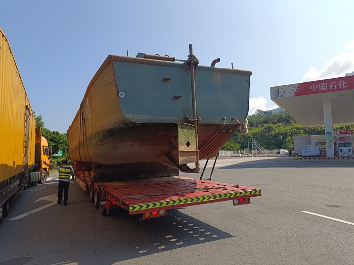 9月11日上午,漳州高速执法支队四大队在G1523甬莞高速小溪服务区与高速交警开展联合执法检查时,发现一辆重型半挂车载着一艘清沙船缓缓驶入服务区。硕大的船身在大货车平板上十分明显,从后方看只见船身不见车头。