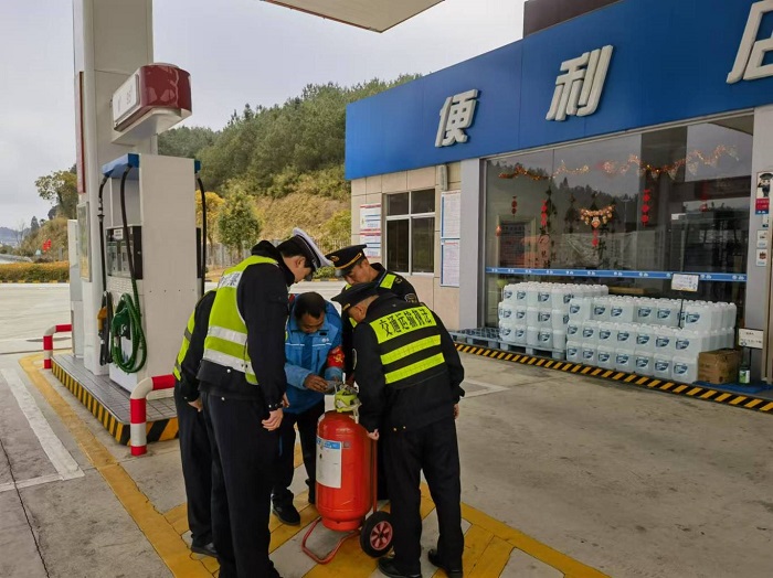 在政永高速鸳鸯溪服务区加油站,执法人员对泡沫灭火器重点检查,精确核对灭火器生产日期与检验周期,测量灭火器罐体压力。同时进行现场模拟,指导加油站工作人员正确使用灭火器。
