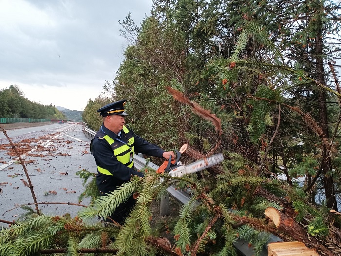 近日,长深高速公路长汀段遭遇强风突袭,B线长汀服务区附近多处树木倒伏阻碍交通。龙岩高速执法支队接警后迅速抵达现场。面对主车道被多棵树木侵占的险情,执法人员设置安全警示区,协助高速交警采取压缩渠化方式疏导滞留车辆,同步联合养护部门运用电动油锯开展断木分解作业,并清理散落树枝12处。经半小时紧急处置,200余米受阻路段全面恢复通行。