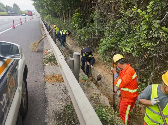 执法人员联合高速交警、养护、路勤人员对桥下空间、隧道、涵洞、高边坡、长下坡、排水沟、绿化树木及地势低洼、易积水路段等进行全面排查,全面梳理防汛隐患点与薄弱环节,防范积水、滑坡、溜方等险情,并且提前放置布控设施。在周末两天内,完成沈海高速2313—2315K、2321—2322K共4公里边沟的淤泥和落叶等清理工作,提升排水能力,修剪过密的绿化树木6处。