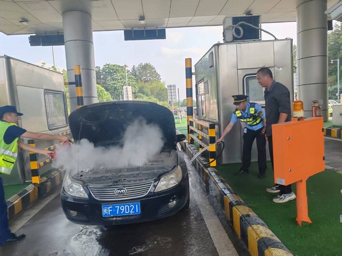 现场执法人员迅速分工行动:一组从执法车上取出2具灭火器,对车辆起火部位进行喷射压制;另一组联合收费站工作人员,利用站口消防栓连接水带,对车辆底盘、发动机舱等重点部位实施冷却降温。经过近10分钟紧张扑救,火势得到有效控制,成功避免了车辆完全燃烧和二次事故发生。