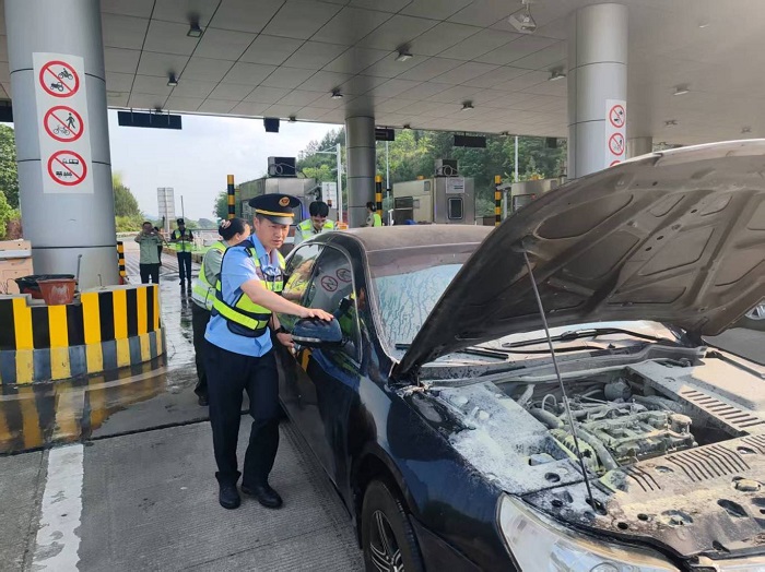 龙岩高速执法支队二大队执法人员在武平收费站执勤时,发现一辆小型轿车尾部冒黑烟驶入收费广场。执法人员立即启动“5+N”联勤联动机制,与收费站工作人员、路勤人员展开协同处置。