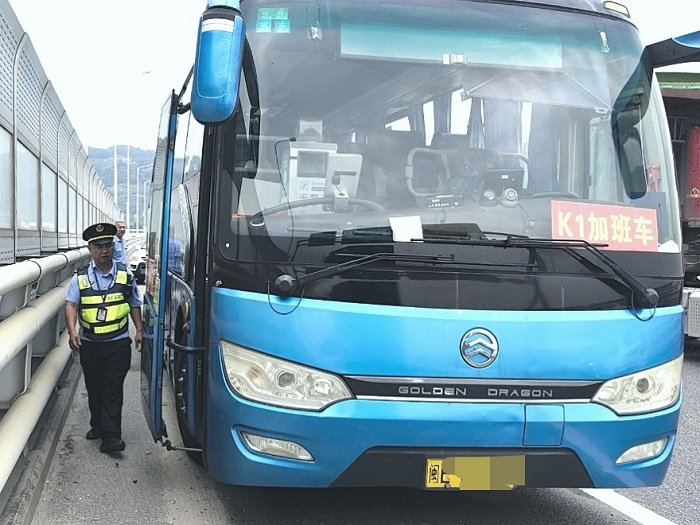 厦漳大桥厦门往漳州方引桥处,一辆大客车抛锚在应急车道内。厦门高速执法支队执法人员立即与高速交警、抢修队等“5+N”联动协作单位赶赴处置。